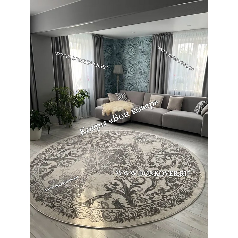 Элегантный Круглый Ковер Для Гостиной Дизайн 29948 Белый с Серым наполняет интерьер квартиры теплом и уютом, гармонично сочетает в себе изящество и красоту. Он создан из высококачественных материалов, комфортный и долговечный.